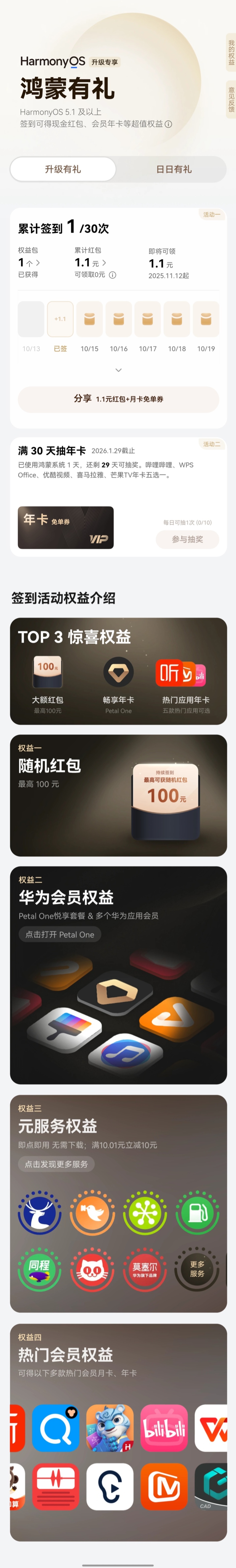 权益一:随机红包,最高 100 元权益二:华为会员权益,含 Petal One 悦享套餐 & 多个华为应用会员权益三:元服务权益,即点即用,无需下载,满 10.01 元立减 10 元权益四:热门会员权益,可得多款热门会员月卡、年卡在上述四项权益之外,平板端用户可参与华为视频年卡抽奖活动 —— 满 30 天抽影视年卡:用户点击活动页面的抽奖按钮,可抽取华为视频影视 VIP 年卡。该活动限定抽奖次数 10 次、每日可抽 1 次。